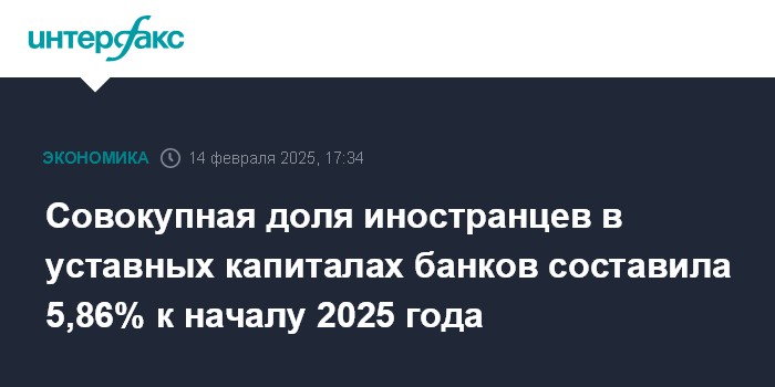 Москва. 14 февраля. INTERFAX.RU - Размер доли участия иностранного капитала в совокупном уставном капитале кредитных организаций, имеющих лицензию на осуществление банковских операций, по данным на 1 января 2025 года составил 5,86%, сообщает Банк России.