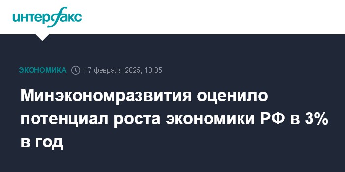 Москва. 17 февраля. INTERFAX.RU - Потенциал роста экономики России составляет 3% в год, заявил глава Минэкономразвития РФ Максим Решетников, выступая на итоговой коллегии министерства.