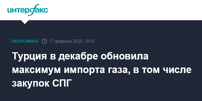 Москва. 17 февраля. INTERFAX.RU - Турция в декабре 2024 года импортировала 7,364 млрд куб. м, что на 21% превышает показатель декабря 2023 года и представляет собой новый абсолютный максимум для истории газовой отрасли страны.