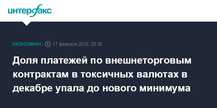 Москва. 17 февраля. INTERFAX.RU - Доля платежей в валютах недружественных государств при расчетах за поставки товаров и оказание услуг по внешнеторговым контрактам РФ в декабре 2024 года снизилась до 16,5% (новый минимум этого показателя) с 17,8% в ноябре, следует из предварительных данных ЦБ РФ о внешней торговле товарами и услугами, а также о валютной структуре внешнеторговых расчетов.