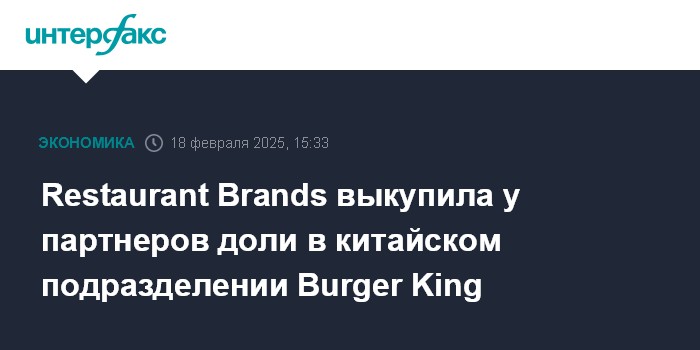 Москва. 18 февраля. INTERFAX.RU - Канадская Restaurant Brands International (RBI), владеющая сетями ресторанов быстрого обслуживания Burger King, Popeyеs Louisiana Kitchen и Tim Hortons, выкупила доли TFI Asia Holdings и Pangaea Two Acquisition Holdings XXIII (Cartesian) в китайском подразделении Burger King.