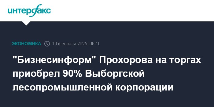 Москва. 19 февраля. INTERFAX.RU - ООО "Бизнесинформ" (Москва) приобрело на торгах 90% долей обанкротившегося ООО "Выборгская лесопромышленная корпорация" (ВЛК, Ленинградская область), говорится в документах площадки ГИС "Торги".