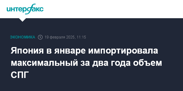 Москва. 19 февраля. INTERFAX.RU - Япония - второй в мире покупатель сжиженного природного газа - в январе 2025 года импортировала 6,641 млн тонн СПГ, что сразу на 9% превышает показатель первого месяца 2024 года (6,109 млн тонн), сообщило министерство финансов страны. До этого импорт снижался четыре месяца подряд.