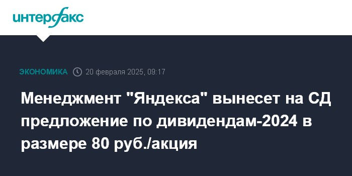 Москва. 20 февраля. INTERFAX.RU - Менеджмент МКПАО "Яндекс" планирует вынести на рассмотрение совета директоров рекомендацию по дивидендам за 2024 год в размере 80 рублей на акцию, сообщила интернет-компания.