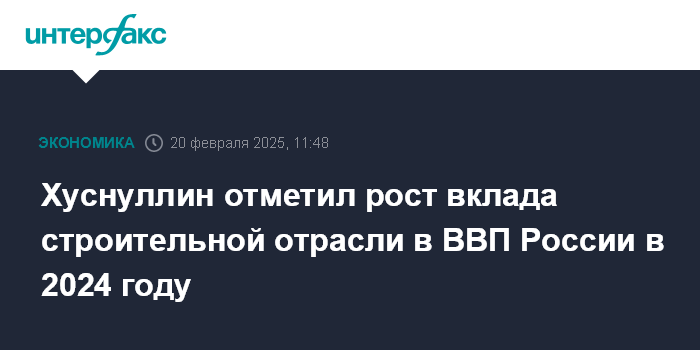Москва. 20 февраля. INTERFAX.RU - Вклад строительной отрасли в ВВП России в 2024 году может превысить показатели 2023 года, сказал вице-премьер Марат Хуснуллин на заседании рабочей группы комиссии Госсовета по направлению нового национального проекта "Инфраструктура для жизни".
