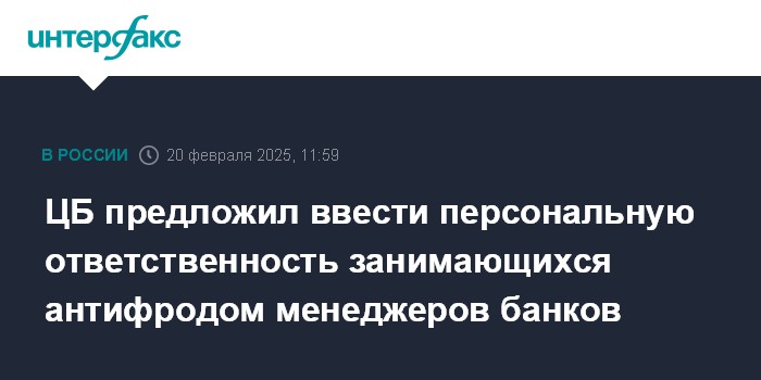 Москва. 20 февраля. INTERFAX.RU - Банк России предлагает ввести персональную ответственность топ-менеджеров кредитных организаций, которые отвечают за организацию антифрод-процедур в банках, сообщила на пресс-конференции глава ЦБ Эльвира Набиуллина.