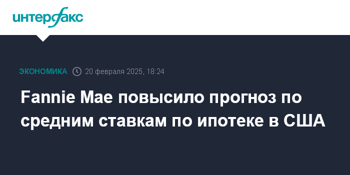 Москва. 20 февраля. INTERFAX.RU - В США средний размер ставок по 30-летней ипотеке в 2025 году составит 6,8% годовых, а в 2026 году снизится до 6,5%, показывает февральский прогноз ипотечного агентства Fannie Mae.