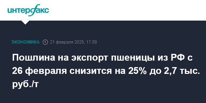 Москва. 21 февраля. INTERFAX.RU - Ставка пошлины на экспорт пшеницы из РФ с 26 февраля снизится на 25% до 2 тыс. 742,6 рубля с 3 тыс. 984,2 рубля за тонну неделей ранее, сообщает Минсельхоз.