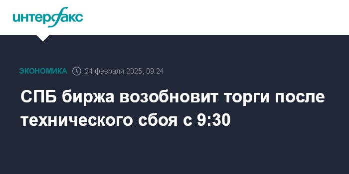 Москва. 24 февраля. INTERFAX.RU - Торги ценными бумагами на "СПБ бирже" возобновятся в 9:30 по Москве, говорится в сообщении площадки.
