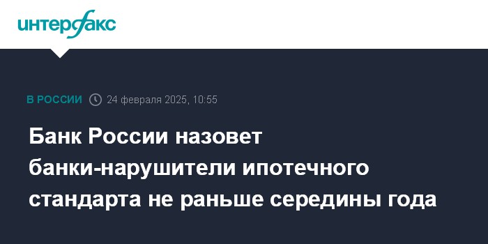 Москва. 24 февраля. INTERFAX.RU - Банк России опубликует список банков, нарушающих ипотечный стандарт, не раньше середины 2025 года, заявил "Интерфаксу" директор департамента банковского регулирования и аналитики ЦБ Александр Данилов.