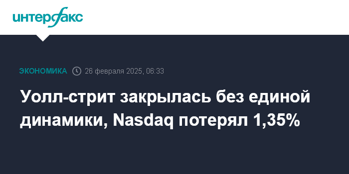 Москва. 26 февраля. INTERFAX.RU - Американские фондовые индексы завершили с разнонаправленными изменениями торги во вторник: Dow Jones слабо вырос, S&P 500 умеренно снизился, а Nasdaq Composite упал на 1,35%, вступив в фазу коррекции - то есть потерял более 10% с последнего пика.