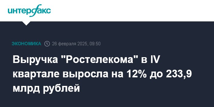 Москва. 26 февраля. INTERFAX.RU - Выручка ПАО "Ростелеком" в IV квартале 2024 года составила 233,9 млрд рублей, что на 12% больше, чем за аналогичный период предыдущего года, говорится в сообщении компании.