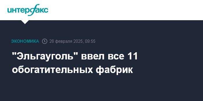 Москва. 26 февраля. INTERFAX.RU - Угледобывающий холдинг "Эльгауголь" запустил в эксплуатацию все запланированные к строительству обогатительные фабрики, сообщил в Telegram министр промышленности и геологии Якутии Максим Терещенко.