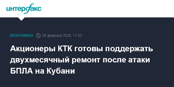 Москва. 26 февраля. INTERFAX.RU - Акционеры Каспийского трубопроводного консорциума готовы содействовать скорейшему завершению ремонтных работ системы после повреждений в результате атаки БПЛА, сообщила пресс-служба КТК.