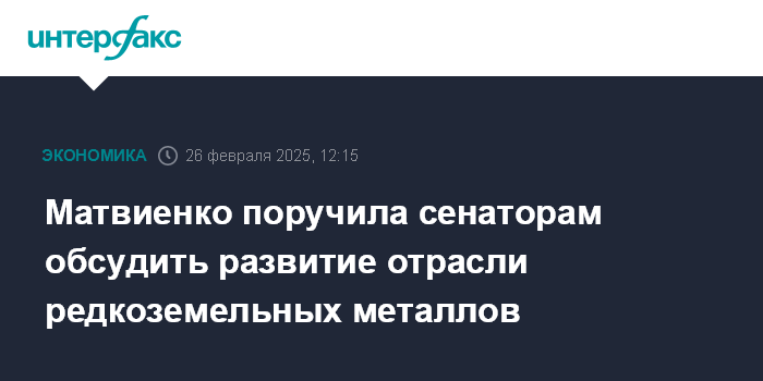 Москва. 26 февраля. INTERFAX.RU - Спикер Совета Федерации Валентина Матвиенко поручила профильным комитетам палаты обсудить с правительством дальнейшее видение разработки месторождений редкоземельных металлов.