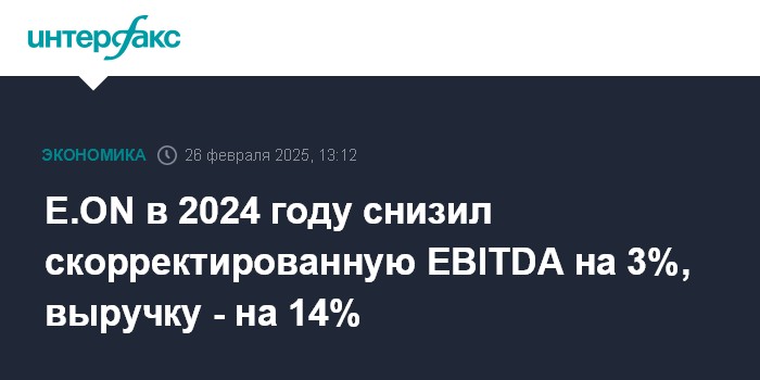 Москва. 26 февраля. INTERFAX.RU - Германский энергетический концерн E.ON SE в 2024 году снизил скорректированную прибыль до налоговых, процентных и амортизационных выплат (EBITDA) на 3% - до 9,05 млрд евро, сообщается в его отчетности.