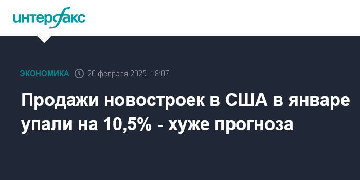 Москва. 26 февраля. INTERFAX.RU - Продажи новых домов в США в январе сократились на 10,5% по сравнению с предыдущим месяцем и составили 657 тыс. в пересчете на годовые темпы, сообщило министерство торговли страны.