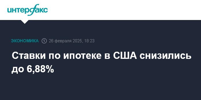Как говорится в сообщении Ассоциации ипотечных банкиров (MBA), средняя процентная ставка по 30-летним кредитам на покупку дома на сумму до $766,55 тыс. на неделе, завершившейся 21 февраля, составила 6,88% годовых против 6,93% неделей ранее.