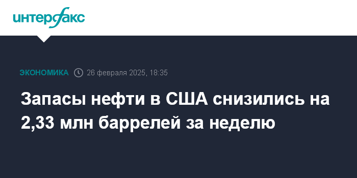 Москва. 26 февраля. INTERFAX.RU - Коммерческие запасы нефти в США на прошлой неделе уменьшились на 2,33 млн баррелей - до 430,16 млн баррелей, говорится в еженедельном докладе министерства энергетики страны.