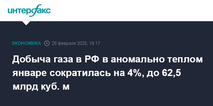 Добыча газа в РФ в аномально теплом январе сократилась на 4%, до 62,5 млрд куб. м