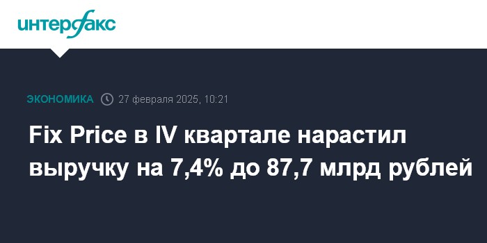 Москва. 27 февраля. INTERFAX.RU - Выручка Fix Price в IV квартале 2024 года выросла на 7,4% по сравнению с аналогичным периодом прошлого года и составила 87,7 млрд рублей, говорится в сообщении компании.