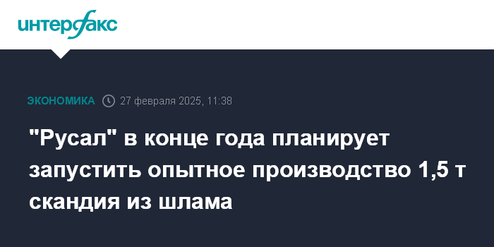 Москва. 27 февраля. INTERFAX.RU - "Русал" в конце 2025 года планирует запустить в эксплуатацию опытный участок по производству 1,55 тонны оксида скандия в год, сообщила компания.