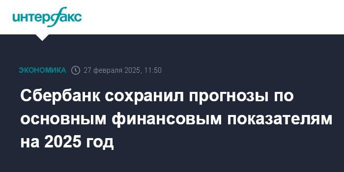 Москва. 27 февраля. INTERFAX.RU - Сбербанк сохранил прогнозы по основным финансовым показателям на 2025 год, по-прежнему ждет рентабельность капитала свыше 22%, следует из презентации кредитной организации.