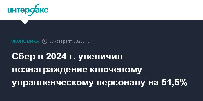 Москва. 27 февраля. INTERFAX.RU - Сбербанк в 2024 году увеличил вознаграждение ключевому управленческому персоналу на 51,5% - до 25,3 млрд рублей с 16,7 млрд рублей в 2023 году, следует из отчета кредитной организации по МСФО.