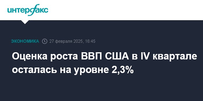 Москва. 27 февраля. INTERFAX.RU - Экономика США в четвертом квартале 2024 года выросла на 2,3% в пересчете на годовые темпы, по пересмотренным данным Министерства торговли страны.