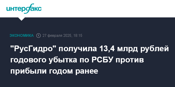 "РусГидро" получила 13,4 млрд рублей годового убытка по РСБУ против прибыли годом ранее