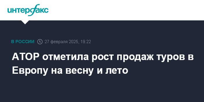 Москва. 27 февраля. INTERFAX.RU - Продажи туров в Европу на весну и лето у российских туркомпаний в 2025 году заметно выросли, среди причин - удешевление авиабилетов, стабилизация ситуации с оформлением виз, отложенный спрос, сообщила Ассоциация туроператоров России (АТОР).