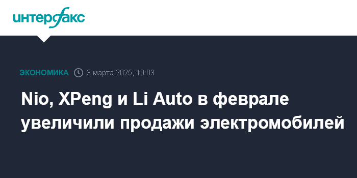Москва. 3 марта. INTERFAX.RU - Китайские производители электромобилей Nio, XPeng и Li Auto увеличили продажи электромобилей в феврале 2025 года в годовом исчислении, сказано в сообщениях компаний.