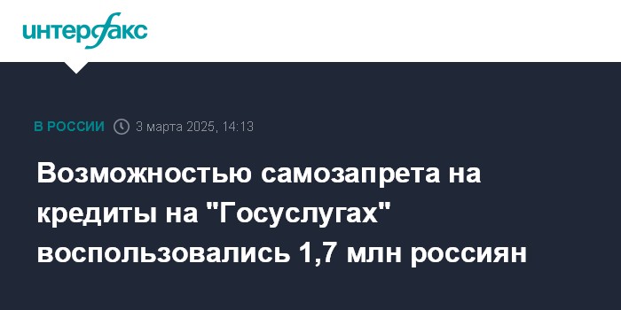 Москва. 3 марта. INTERFAX.RU - Сервисом по самозапрету на кредиты на Едином портале государственных и муниципальных услуг (Госуслуги) за два дня с 1 марта воспользовались 1,7 млн человек, сообщило Минцифры.