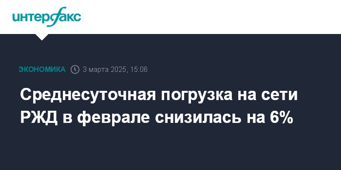 Москва. 3 марта. INTERFAX.RU - Погрузка на сети ОАО "Российские железные дороги" в феврале 2025 г. составила 87 млн тонн, что на 9,3% меньше, чем за 29 дней февраля прошлого года (в 2025году в феврале 28 дней - ИФ); среднесуточная погрузка составила 3,106 млн тонн, что на 6% меньше предыдущих показателей, сообщила компания.