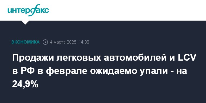 Москва. 4 марта. INTERFAX.RU - Продажи новых легковых и легких коммерческих автомобилей (LCV) в России в феврале 2025 года ожидаемо показали существенное снижение, сократившись на четверть в годовом выражении.