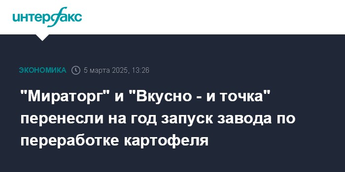 Москва. 5 марта. INTERFAX.RU - Ввод в эксплуатацию комплекса по глубокой переработке картофеля ООО "Гранд Фрайз" (совместное предприятие агрохолдинга "Мираторг" и компании "Вкусно - и точка") в Мценском районе Орловской области предполагается во втором полугодии 2026 года.