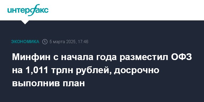 Москва. 5 марта. INTERFAX.RU - Министерство финансов с начала 2025 года и по 5 марта включительно разместило облигации федерального займа (ОФЗ) в общей сложности на сумму 1,011 трлн рублей по номиналу (без учета дополнительных размещений после аукционов 5 марта) при плане на первый квартал 1 трлн рублей по номиналу.