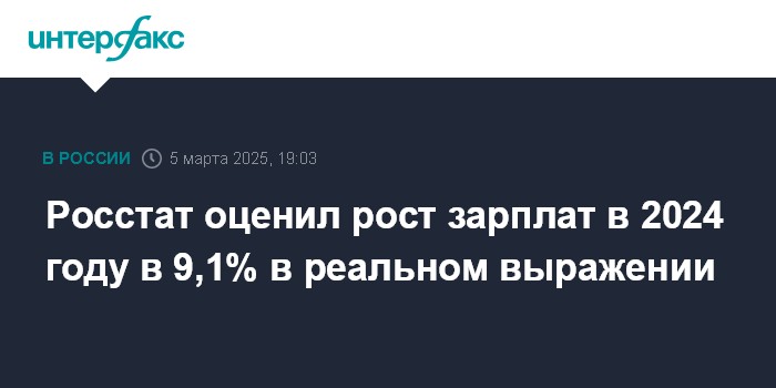 В целом за 2024 год реальный размер средней заработной платы вырос в РФ на 9,1% после роста на 8,2% в 2023 году. Согласно представленному в сентябре обновленному макропрогнозу Минэкономразвития, рост реальных заработных плат в РФ в 2024 году прогнозировался на уровне 9,2%.
