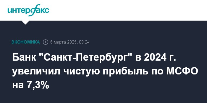 Банк "Санкт-Петербург" в 2024 г. увеличил чистую прибыль по МСФО на 7,3%