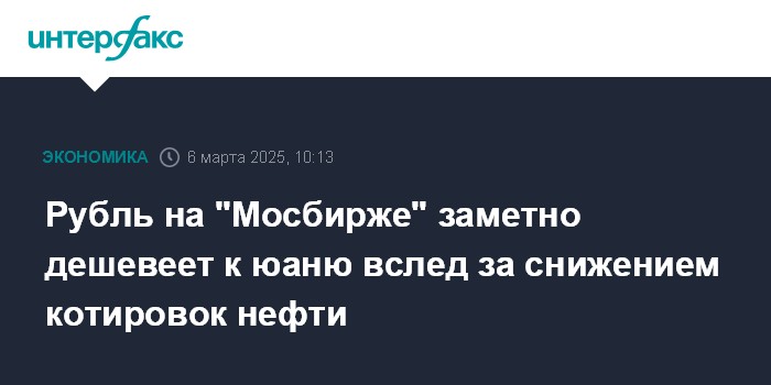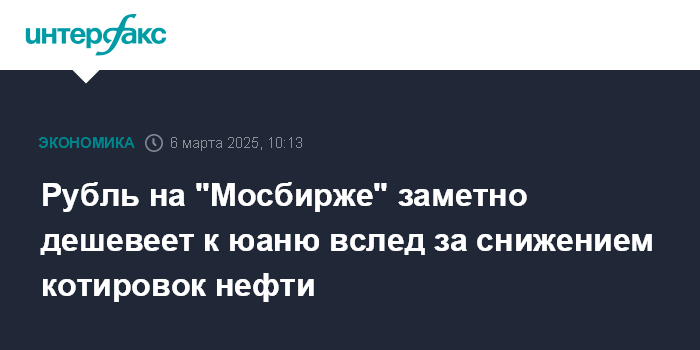 Москва. 6 марта. INTERFAX.RU - Утром в четверг на "Московской бирже" рубль заметно дешевеет к юаню вслед за нефтью, котировки которой накануне упали до минимальных отметок с середины сентября.