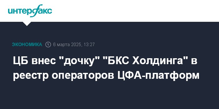 Москва. 6 марта. INTERFAX.RU - Банк России включил "Компанию Брокеркредитсервис (БКС)" в реестр операторов информационных систем (ОИС), в которых осуществляется выпуск цифровых финансовых активов (ЦФА), говорится в сообщении ЦБ.