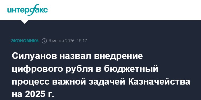Москва. 6 марта. INTERFAX.RU - Внедрение цифрового рубля в бюджетный процесс - одна из основных задач Федерального казначейства на 2025 год, сказал глава Минфина Антон Силуанов, слова которого приводит пресс-служба министерства.