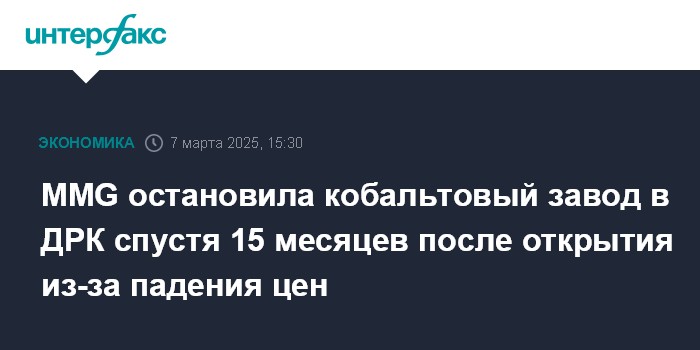Москва. 7 марта. INTERFAX.RU - Китайская горнодобывающая компания MMG Ltd. законсервировала завод по переработке кобальта в Демократической Республике Конго спустя всего 15 месяцев после его открытия из-за резкого падения цен на металл.