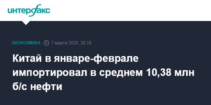Москва. 7 марта. INTERFAX.RU - Среднесуточный объем импорта нефти Китаем в январе-феврале 2025 года составил почти 10,38 млн б/с, свидетельствуют расчеты "Интерфакса" на основе данных Главного таможенного управления КНР.