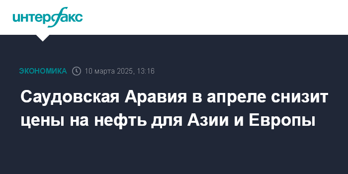 Москва. 10 марта. INTERFAX.RU -Саудовская Аравия в апреле снизит цены на нефть с поставкой в страны Азии и Европы.