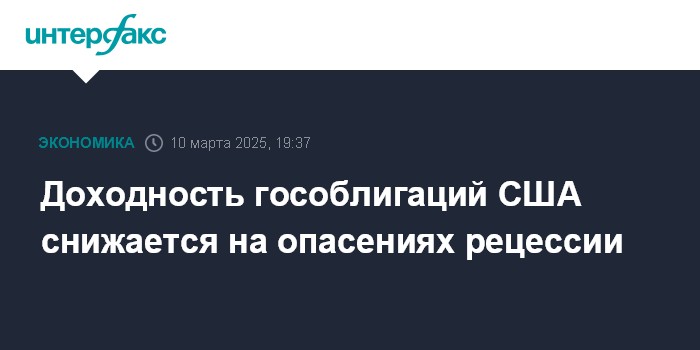 Москва. 10 марта. INTERFAX.RU - Доходность американских государственных облигаций снижается в понедельник на возросших опасениях рецессии в Соединенных Штатах.