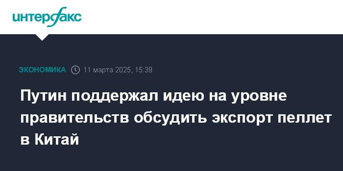 Москва. 11 марта. INTERFAX.RU - Вопрос открытия китайского рынка для поставок российских топливных гранул может быть проработан на уровне правительств двух стран. Идею обсуждения этого вопроса с руководством КНР поддержал президент РФ Владимир Путин на встрече с губернатором Архангельской области Александром Цыбульским.