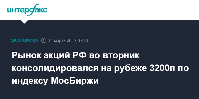 Москва. 11 марта. INTERFAX.RU - Рынок акций РФ во вторник провел торги в консолидационных настроениях при смешанной динамике цен blue chips в ожидании новостей с американо-украинских переговоров по вопросу мирного урегулирования конфликта вокруг Украины; утренние продажи были остановлены отскоком нефти вверх (фьючерс на Brent отыграл рубеж $70 за баррель). Индекс МосБиржи на фоне укрепления рубля закрепился на рубеже 3200 пунктов после утреннего снижения ниже 3180 пунктов; лидерами роста выступили бумаги "Мосбиржи" (+2%).
