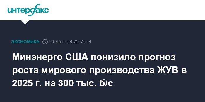 Москва. 11 марта. INTERFAX.RU - Минэнерго США понизило прогноз роста мирового производства жидких углеводородов (ЖУВ) в 2025 г. на 300 тыс. б/с - до 1,4 млн б/с, полагая отставание от плана в ОПЕК+