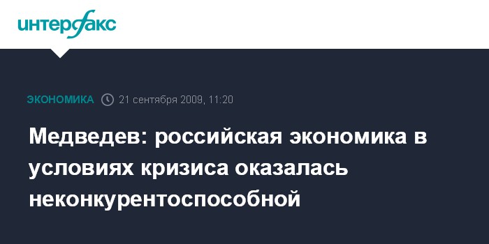 Москва. 21 сентября. INTERFAX.RU - Президент России Дмитрий Медведев отмечает, что последствия влияния кризиса на экономику в России оказались не оценены должным образом. "Наша экономика, несмотря на то, что все, что было сделано за последнее время, развивало ее, помогало ей вставать на новые рельсы, отходить от сложного прошлого, прежде всего, советского прошлого и 90-х годов, она все-таки оказалась, мягко говоря, не конкурентоспособной в условиях кризиса. И это тяжелое испытание", - заявил Д.Медведев в интервью швейцарским СМИ. Он отметил, что "мы все недооценили последствия влияния кризиса на экономику в нашей стране. Это нужно открыто признать, и я об этом уже сказал".